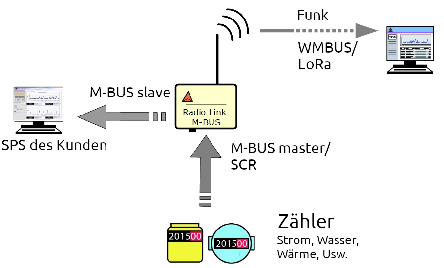 Ein Wireless M-BUS Schnittstelle wird benutzt, um via Radio die gelesene Zählerdaten fernzusenden. Die M-BUS Schnittstelle ist Typ "Master M-BUS". Das bedeutet, dass das Radio Link M-BUS Modu den Zähler liest. Es ist auch m?glich die Zähler mit SCR Schnittstelle lesen.