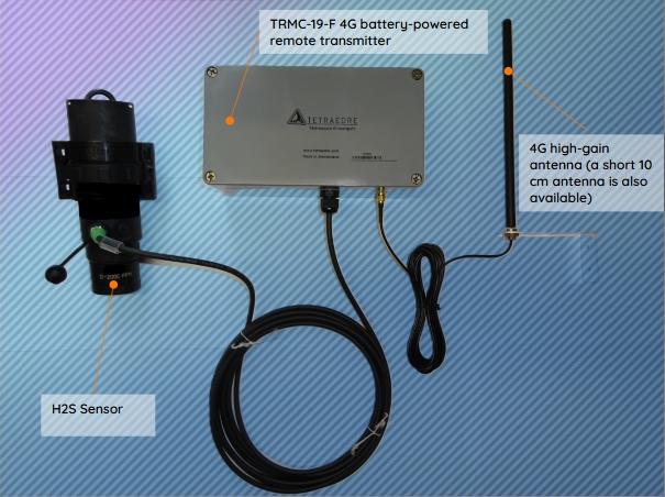 The H2S sensor, coupled to a Tetraedre TRMC remote transmitter, enables concentrations ranging from 0 to 2'000 ppm to be monitored remotely and battery-powered.