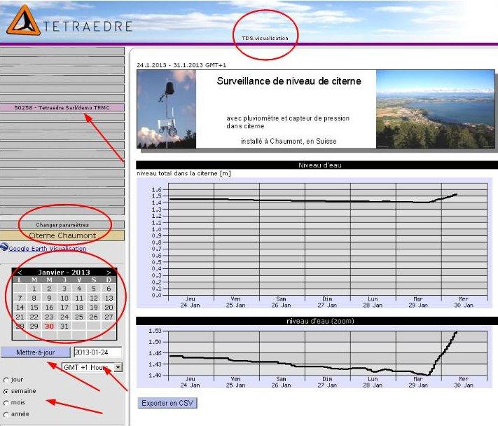 Il est aussi possible d'entrer une date directement dans le champ, au format YYYY-MM-JJ (année 4 digits, mois 2 digits, jour 2 digits). Cette date correspond au T0, c'est-à-dire que l'affichage commencera à cette date-là. Que vous choisissiez une date ou une intervalle de temps, le TDS affichera toujours jusqu'à la donnée la plus récente. En-dessous de la date, on peut également choisir le fuseau horaire. En Europe centrale, choisir GMT+1 pour l'heure d'hiver et GMT+2 pour l'heure d'été. Les boutons "jour", "semaine", "mois" permettent de choisir la durée affichée. Chaque fois que vous changez un paramètre dans cette zone vous devez cliquer sur "Mettre à jour" pour que les informations se mettent à jour.